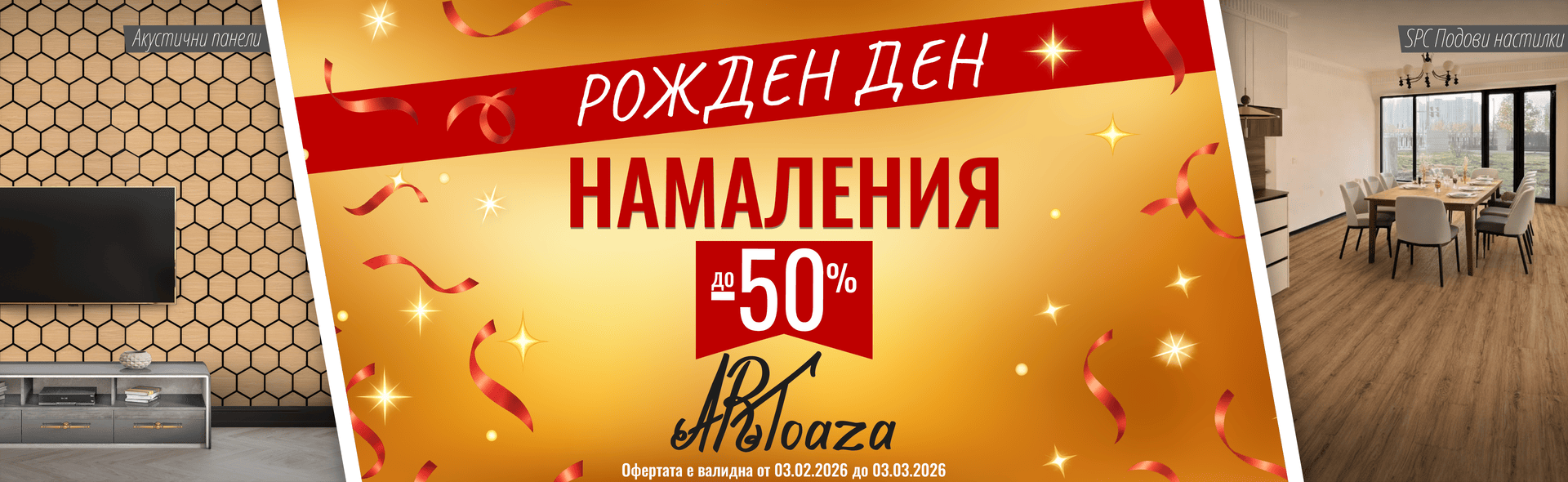 Фирма Artoaza е утвърден директен вносител на 3D тапети и самозалепващи стикери, декоративни PVC панели, големи стенни панели, гъвкави плоскости, които имитират каменни облицовки и множество други продукти, подходящи както за интериорни, така и за екстериорни решения. Компанията постоянно разширява своя продуктов асортимент, като вече предлага и огледала с вградено LED осветление, стилни полилеи, SPC подови настилки, акустични панели и други иновативни решения за бърз, качествен и естетичен ремонт или декорация.